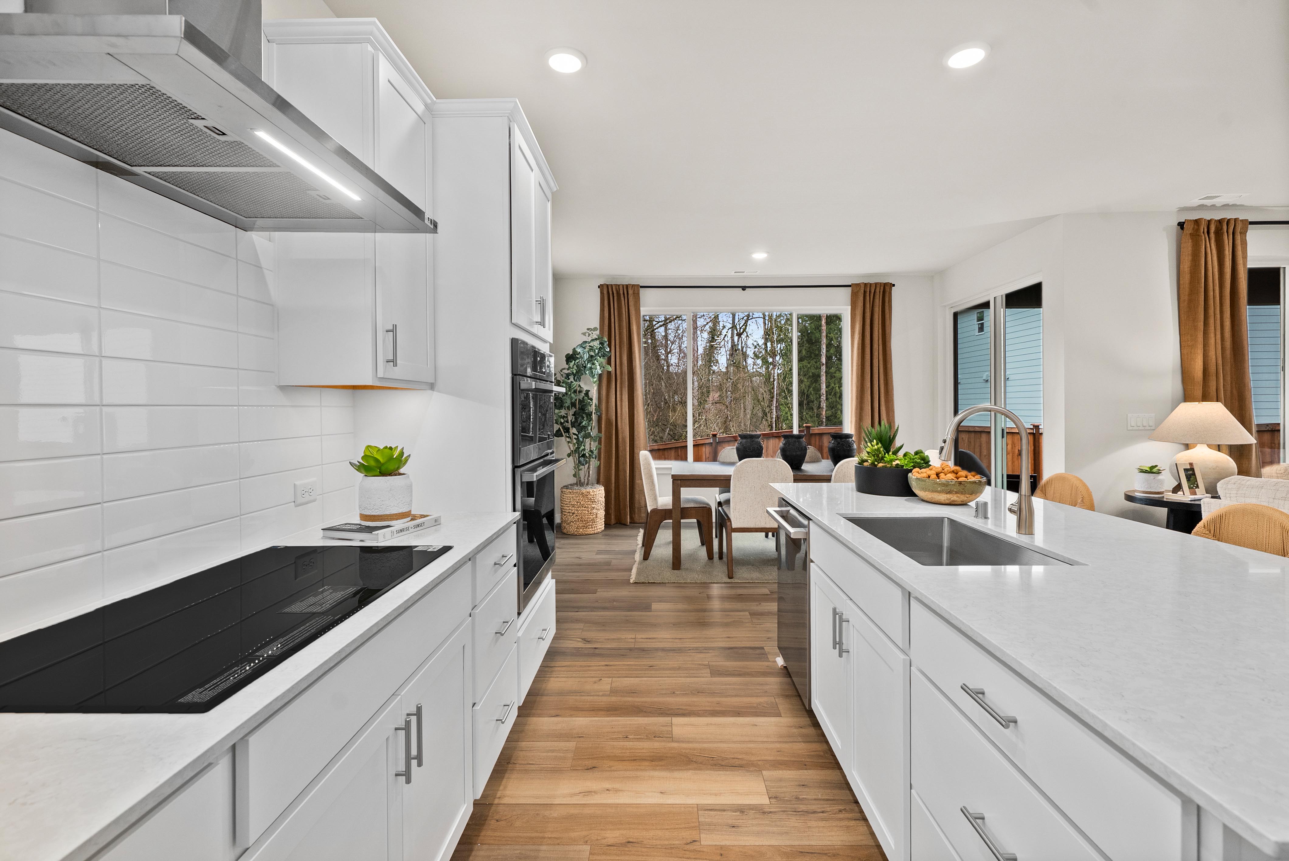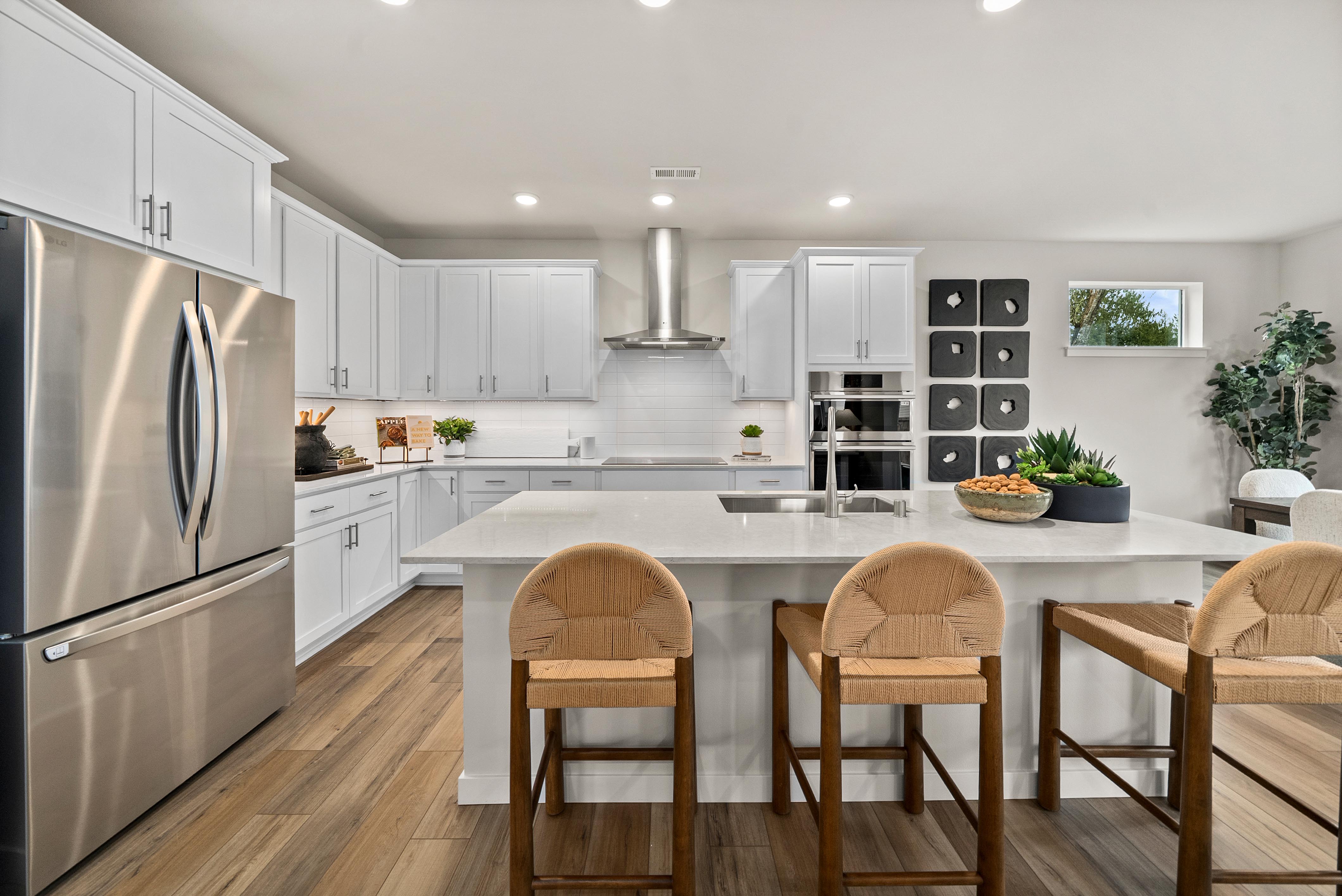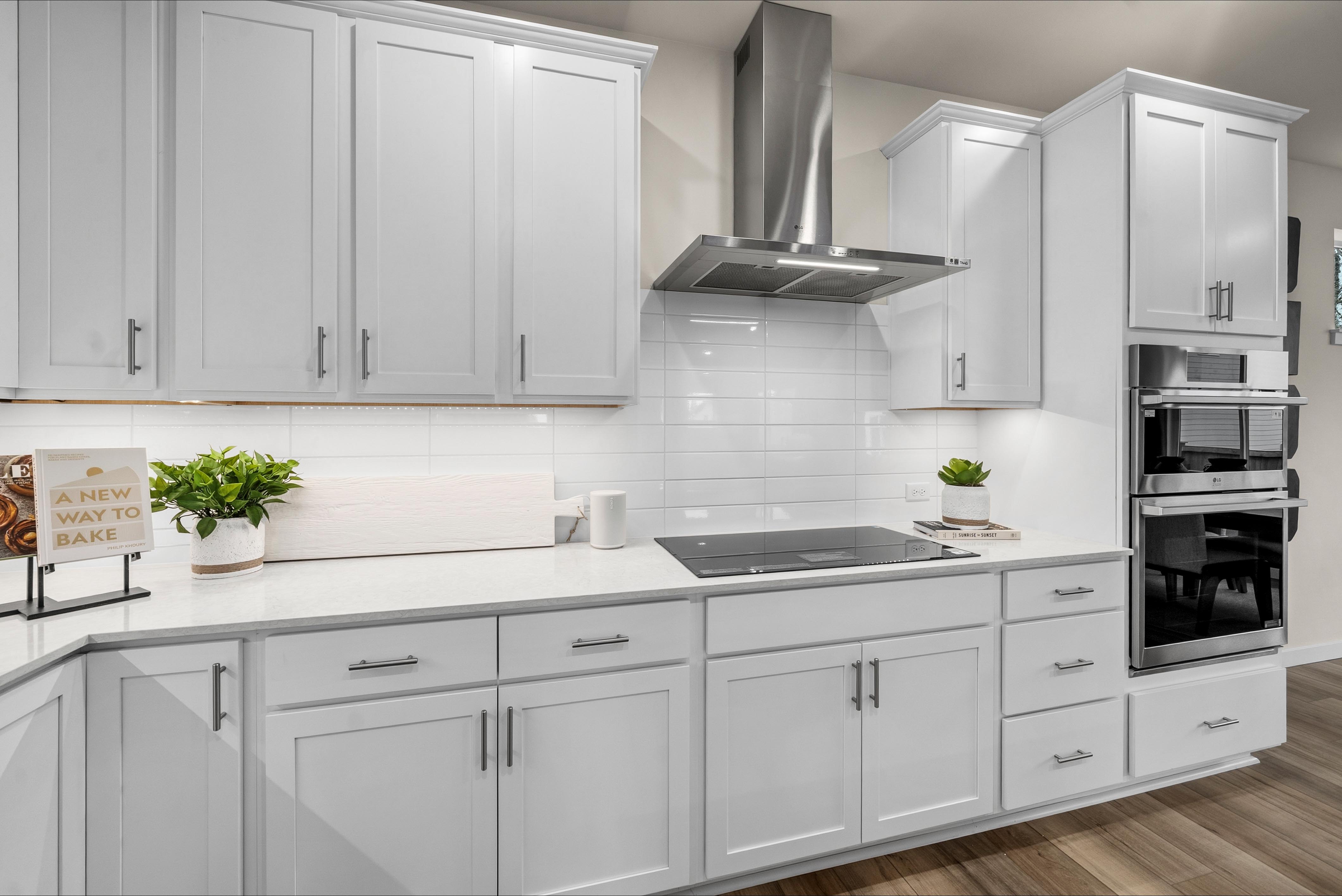 Showcasing thoughtfully designed two-story floor plans, these homes highlight modern features that blend comfort and innovation. Enjoy stylish quartz countertops in the kitchen and primary suite, premium stainless-steel appliances—including a electric cooktop with a 36” wall-mount range hood and smart Wi-Fi oven/microwave combo—plus 34.5-inch cabinets with molding, soft-close doors, pulls, and under-cabinet lighting.